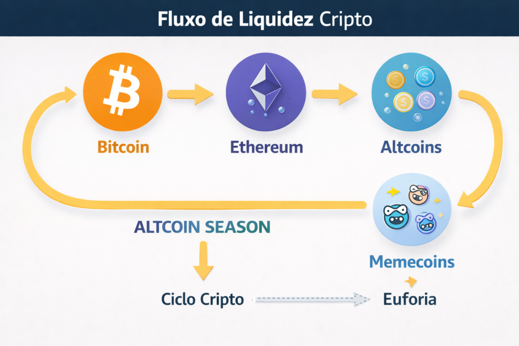 A chave para usar as Altcoins a seu favor é entender o Fluxo de Liquidez: 1. Fase 1: O dinheiro entra no Bitcoin (Segurança). 2. Fase 2: O dinheiro flui para o Ethereum e L1s de grande capitalização. 3. Fase 3: O dinheiro transborda para as L2s e projetos de nicho. 4. Fase 4: A euforia atinge as Memecoins (Sinal de topo de ciclo).
