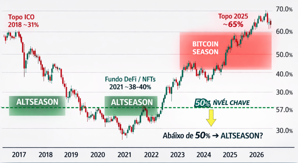 Estatisticamente, o Bitcoin lidera o mercado. Tentar investir em Altcoins quando a dominância do Bitcoin está em tendência de alta é como tentar nadar contra uma cachoeira. Você pode até ganhar em dólares, mas está perdendo em Bitcoin — e no final do dia, o Bitcoin é a unidade de medida da riqueza real.