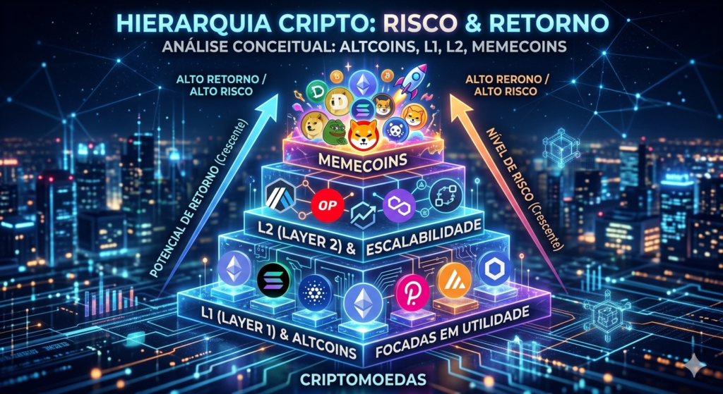 Nem todas as Altcoins são criadas iguais. Elas se dividem em uma hierarquia de risco e fundamento que você precisa dominar.