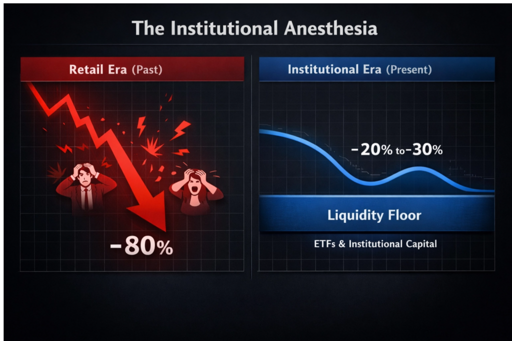 Nos ciclos passados, as correções eram brutais, impiedosas, de 80% ou mais, porque o varejo, movido pelo pânico irracional, vendia tudo, sem pensar, sem estratégia, apenas para estancar a dor, para fugir do sofrimento. Não havia um “piso” de absorção, um amortecedor para as quedas, uma mão forte para segurar o mercado. Mas agora, os ETFs da BlackRock e Fidelity, os fundos de pensão e as tesourarias corporativas criaram um novo paradigma, uma nova realidade, uma nova ordem.
